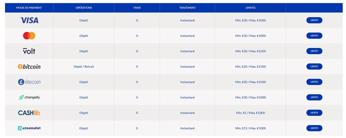 - Portefeuille électronique (eZeeWallet) — Dépôt instantané, montant minimum faible (~20€).